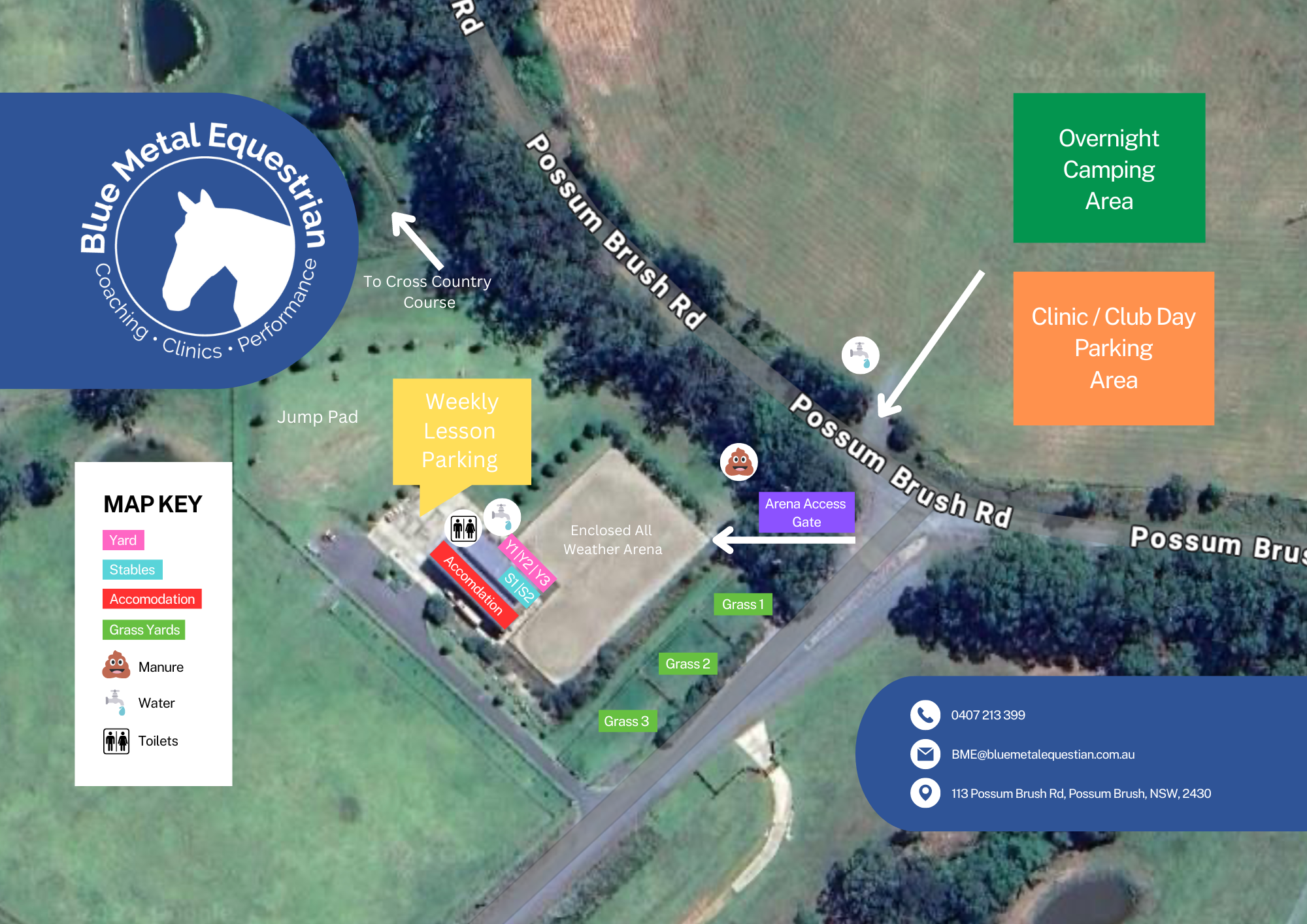 BME at Possum Brush is a family owned and operated boutique equine facility on the mid north coast of NSW. Offering coaching, clinics and protocol days to provide education, support and encouragement, we are committed to help you reach your riding goals. Come join us and improve your Dressage, Cross-Country and Show Jump riding in small groups or private lessons with accredited coaches. Nestled in the beautiful Manning Valley on 600 undulating acres that weave through forest, creeks and open plains and backing onto state forest; this well-appointed facility boasts a landscape for equine training and fitness. Established facilities include a Flexi Fibre 60 x 40 dressage arena with a 20 x 40 extension; a contoured grass jump pad; stables with turn outs; grassed yards; wash bays; bathroom and rider’s retreat and an extensive cross country course.